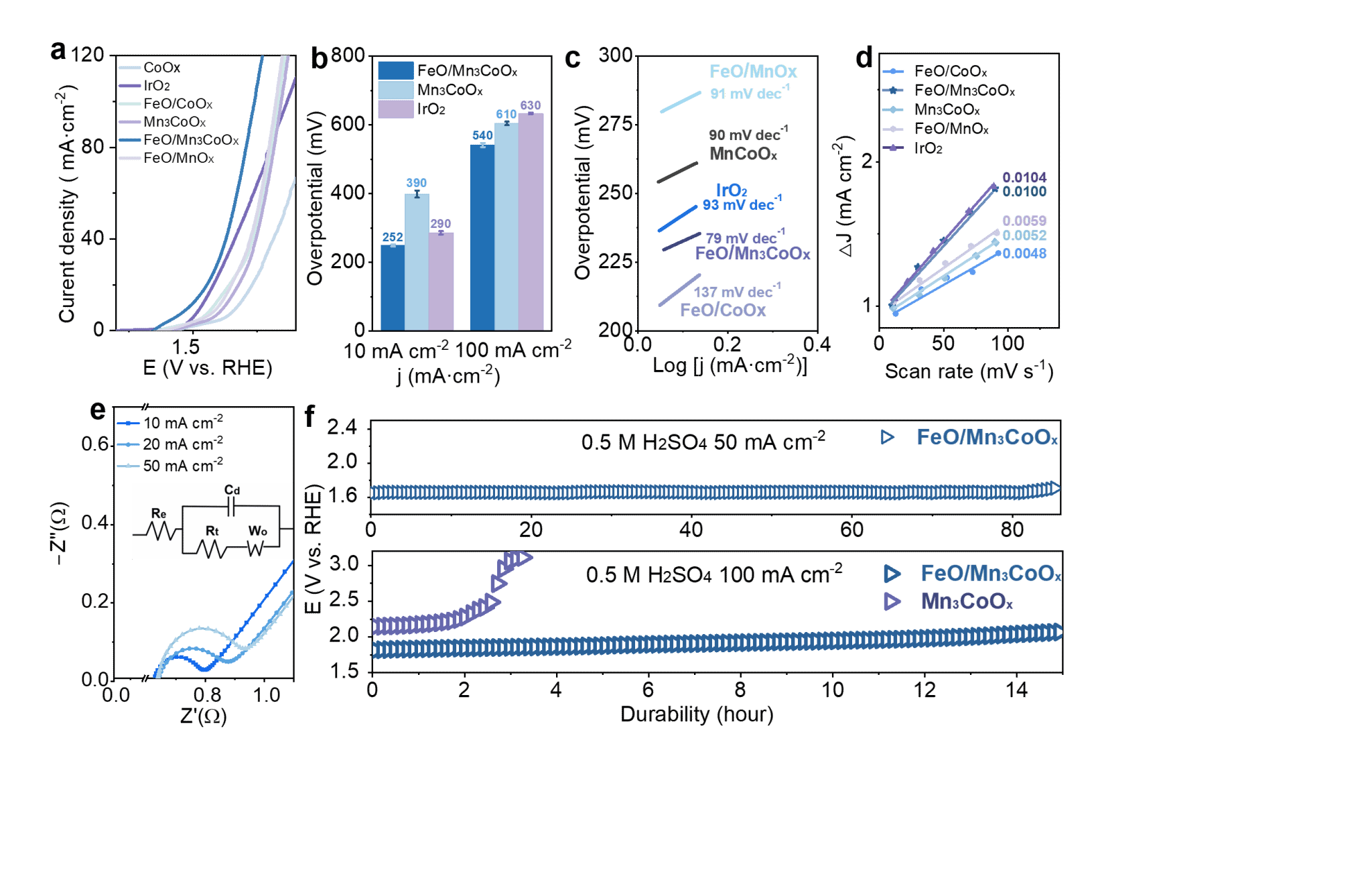 Figure 1: (a) Polarization curves of FeO/Mn3CoOx, Mn3CoOx and reference samples in a 0.5 M H2SO4 (pH 0) solution. (b) Overpotentials, (c) Tafel plots, (d) Cdl values, and (e) Nyquist plots (@Ej=10, 20, 50) of FeO/Mn3CoOx. (f) Potential required to reach 50 and 100 mA cm−2 in 0.5 M H2SO4 for FeO/Mn3CoOx measured using chronopotentiometry holds.